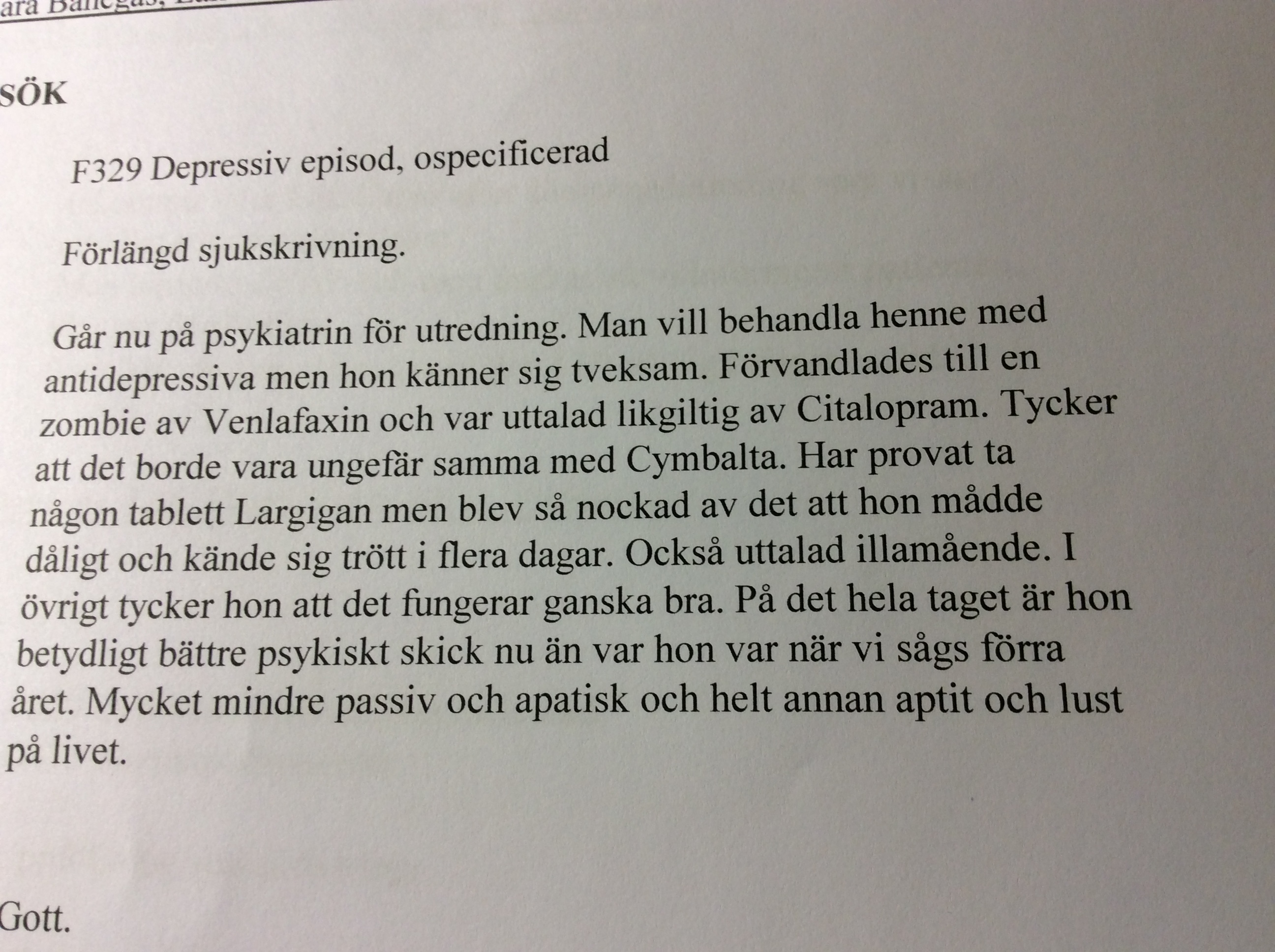 Jag kan läsa i journalen att läkaren i augusti upplevde mig uppgiven och nedstämd och orolig för att jag inte skulle fortsätta orka hålla fast vid kosten. Det hade gått över en månad utan Venlafaxin och det var innan jag fick den nya medicinen så jag var helt utan medicin. Jag kan också läsa från ett läkarbesök på VC i oktober att jag helt glömt en medicin jag fick när psyk skrev ut Cymbalta. Jag fick Lergigan som jag skulle ta för att jag tyckte det var obehagligt att ta antidepressiv medicin.