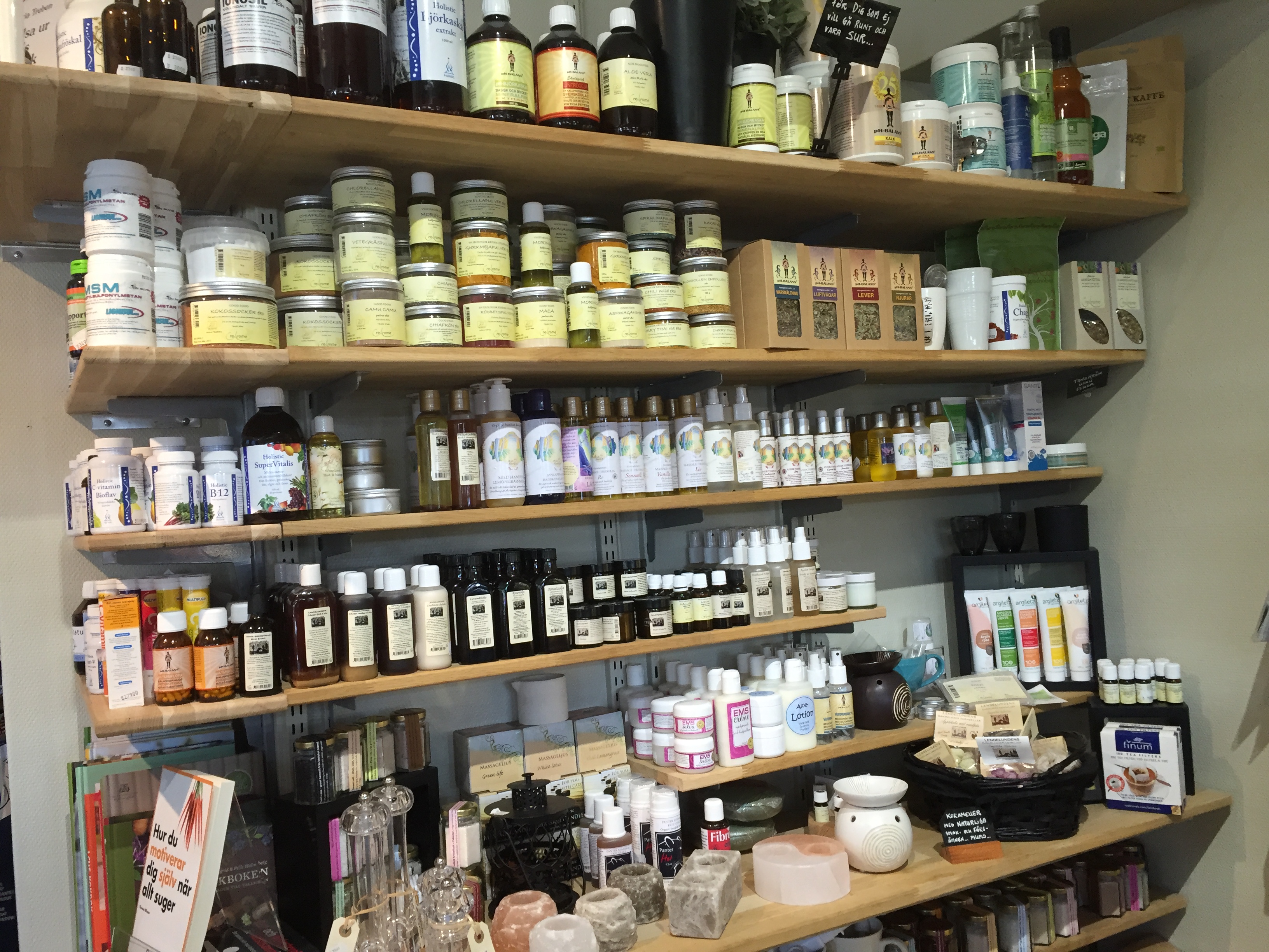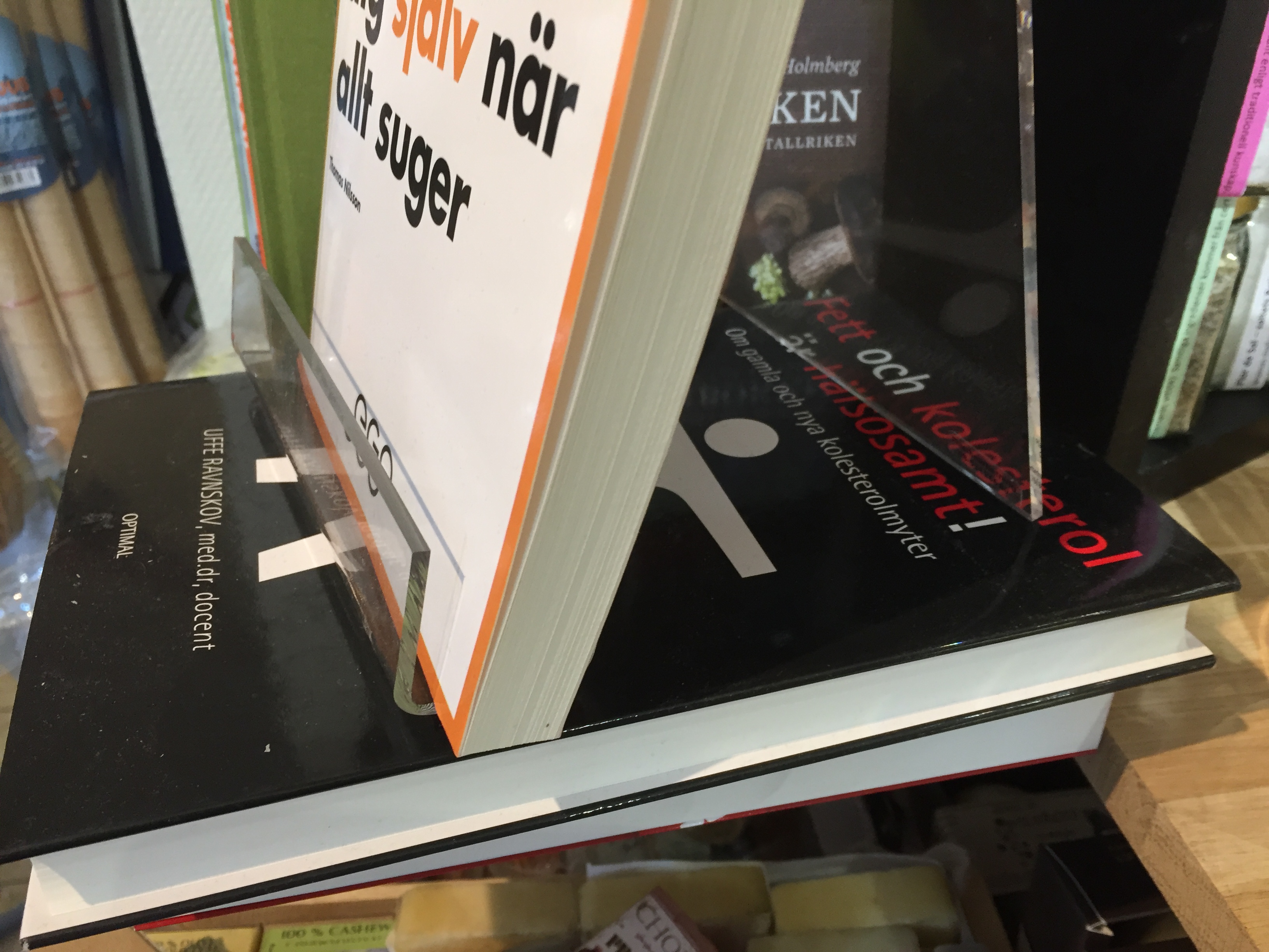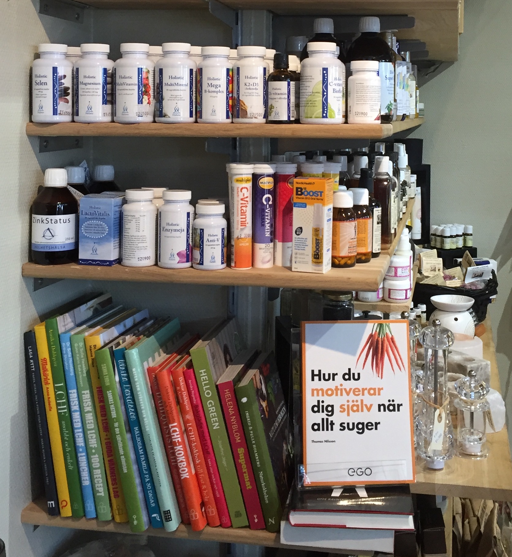 Gissa om jag blev glatt överraskad när det första jag ser i butiken är en hälsokosthylla med bra produkter och det andra en bokhylla med Uffe Ravnskovs bok om kolesterol och flera LCHF-böcker tex Annika Dahlqvists.